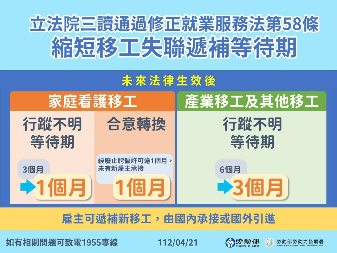就業服務法第58條規定,產業移工及家事移工逃跑,即使不可歸責雇主,仍需有6個月及3個月的「遞補等待期」,才可再申請新移工,而立法院今天三讀通過「就業服務法第58條條文修正草案」,將「遞補等待期」分別縮減為3個月及1個月,初估有2千家企業、1千個家庭受益。